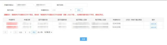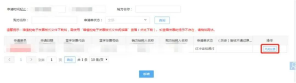 发票开具:可在电子税务局“发票使用-个人出租房屋代开红字发票(增值税电子普通发票)”查看申请记录,显示状态“红冲审核通过”。点击“开具发票”即可。