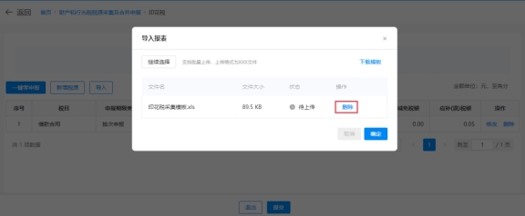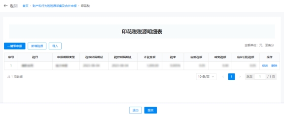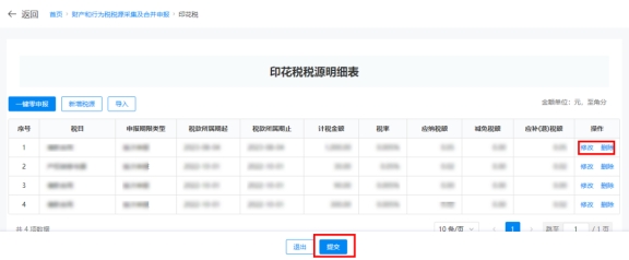 ④上传成功后,系统在印花税税源明细表界面显示上传文件中的税源信息(若需要改动可手动修改),确认无误,点击【提交】。