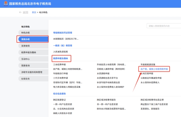 二、我要办税—税费申报及缴纳—房产税、城镇土地使用税申报。