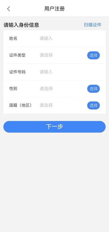 进入身份信息采集页面。身份信息采集可以通过手动输入姓名、证件类型、证件号码、性别、国籍等信息或通过点击右上角“扫描证件”,进入证件扫描界面,按提示进行证件扫描。