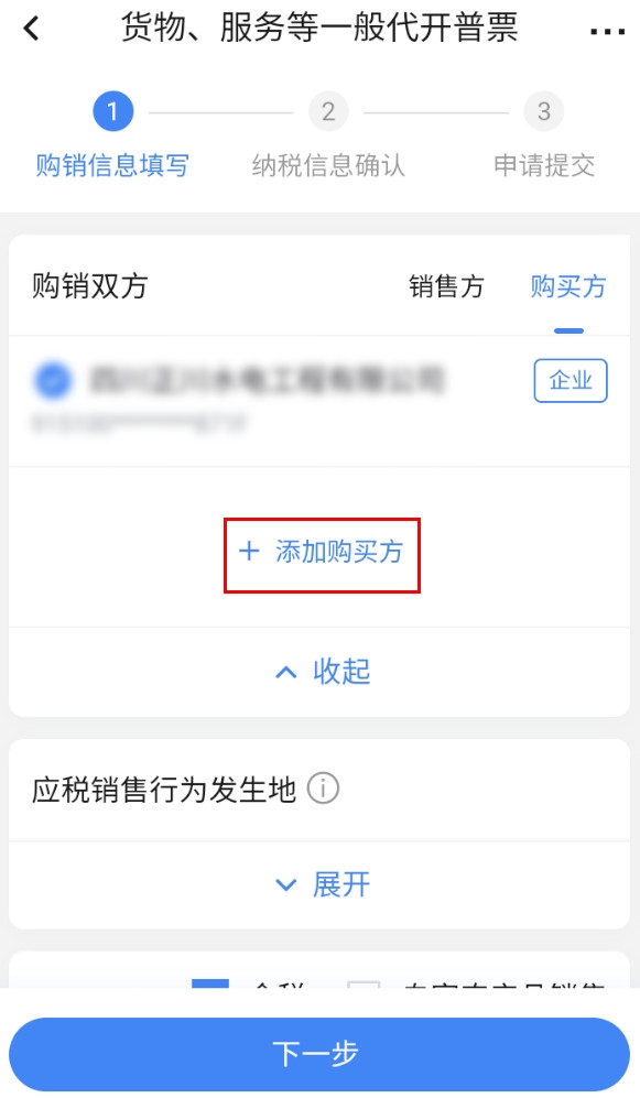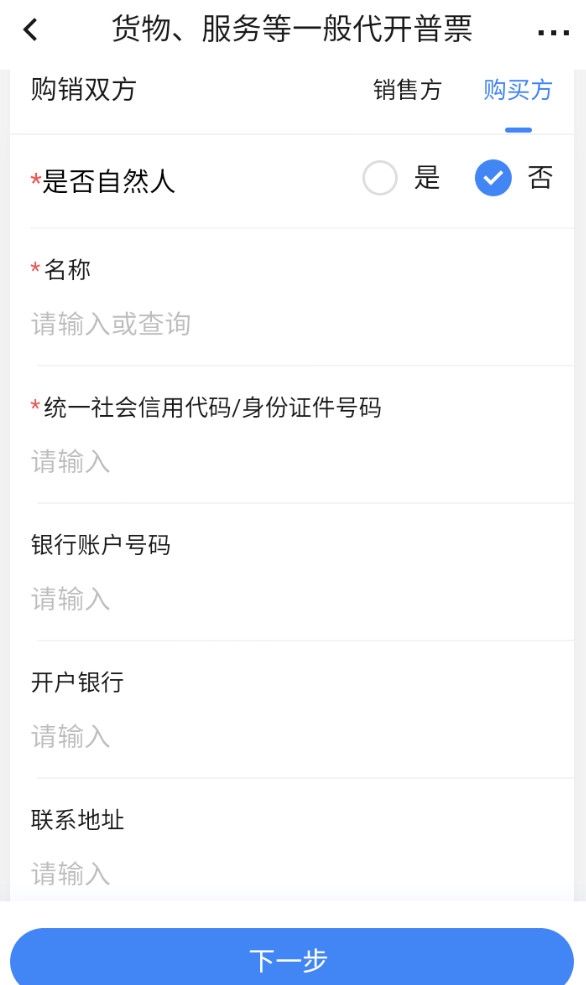 2.3、点击“添加购买方”,选择是否为自然人,录入购买方信息:名称、统一社会信息代码/身份证件号码、银行账户号码、开户银行、联系地址、联系电话、选择是否展示银行信息,点击【保存】。名称项为必填,其他项为选填。