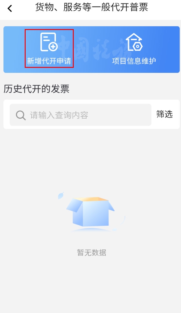 2.2、点击【货物、服务等一般代开】-【新增代开申请】进入代开申请页面。