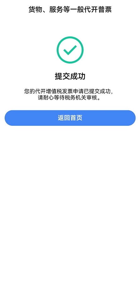 代开申请提交成功,无需审核,无需缴款,可自动完成数电票开具;