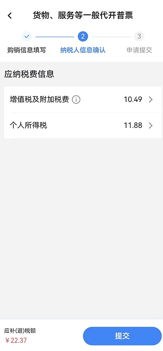 2.7、纳税信息确认:系统根据填写的发票信息自动加载应纳税款信息,纳税人确认无误后点击【提交】。