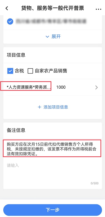 货物、服务等一般代开普票时,若个人所得税品目为劳务报酬、稿酬、特许权使用费所得时,纳税人信息确认界面温馨提示:本次代开申请个人所得税项目为劳务报酬、稿酬、特许权使用费所得时,由购买方次月15日内代扣代缴,如存在异议,请前往税务大厅办理。若为其他个人所得税品目不显示温馨提示。