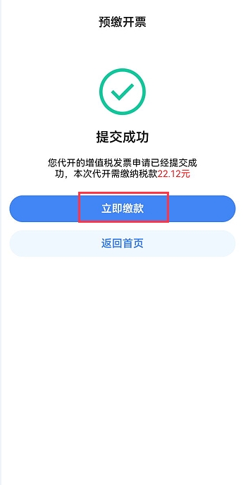 代开申请提交成功,无需审核,需缴款,跳转至预缴开票页面,缴款成功后,可自行开具数电票;