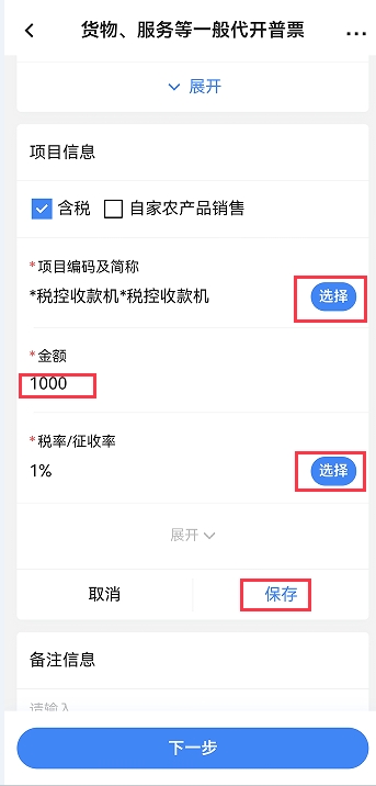 2.5、点击“添加项目信息”录入选择项目编码及简称、录入金额,选择税率,点击【保存】。