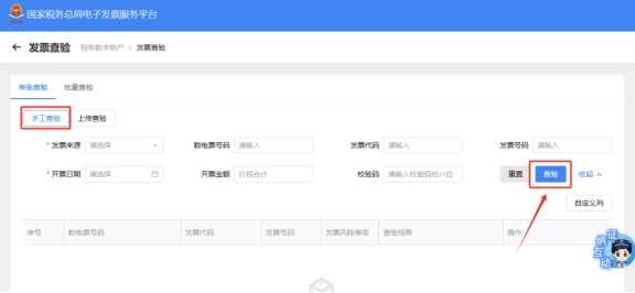 三、发票查验进入查询界面,选择“手工查验”并按实际情况填写相应项目,点击“查验”,系统会显示对应发票查验结果。