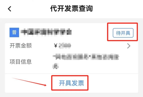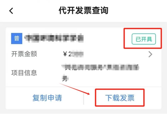 再次点击首页“代开增值税发票”,点击“代开发票信息查询”,选择提交申请的起止日期,点击页面下方的“查询”。在查询结果中找到本次提交的申请,该条申请右上角状态为“待开具”,点击“开具发票”,右上角状态变为“已开具”,点击“下载发票”,即可查看并下载该发票(您可点击发票预览页面右上角“...”将发票分享至对方)。