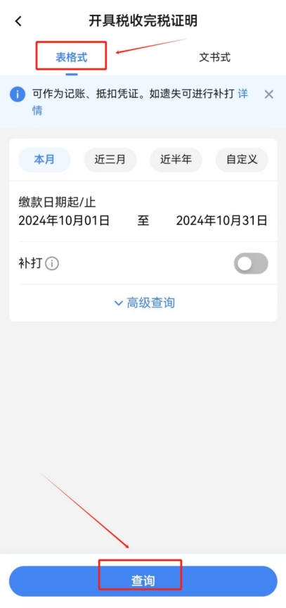 返回首页,点击“开具税收完税证明”,选中“表格式”后点击下方“查询”。
