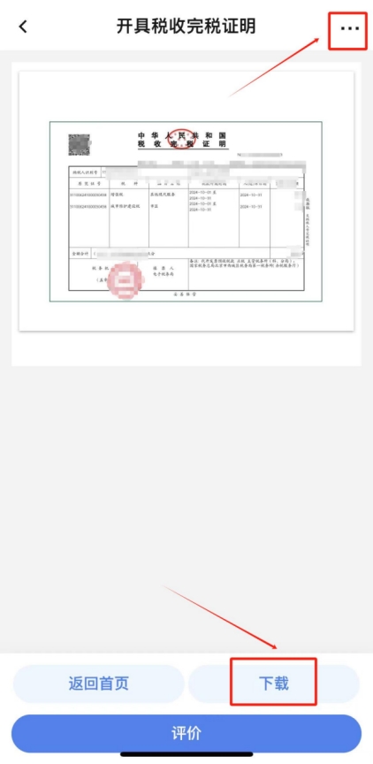 在查询结果中勾选本次缴纳的单笔税款,点击“开具”,即可查看并下载完税证明(如有需要,您可点击完税证明预览页面右上角“...”将发票分享至对方)。