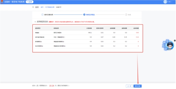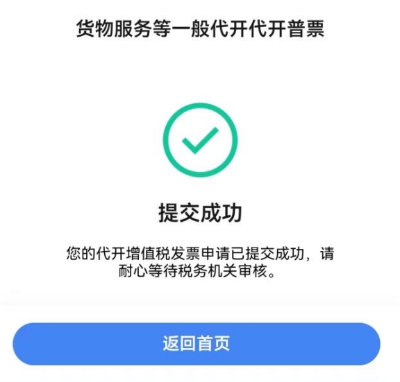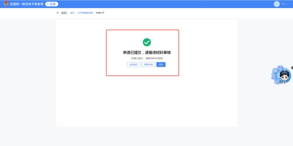 确认系统自动计算的应纳税费信息,无误后点击“提交”,显示“提交成功”后等待税务机关审核即可(税务机关将在半个工作日内完成审核,届时您可按照下方流程查看已提交的申请的审核状态并进行后续操作)。