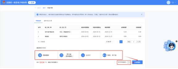 进入缴税页面后,可以看见需要缴纳的税款明细及支付方式,目前支付方式包含银联缴费、银行端(查询缴款)、云闪付、微信、支付宝等方式。也可以跨境缴税。选择完方式后,点击立即缴款。