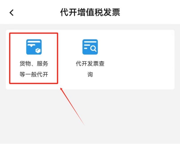 点击“货物、服务等一般代开”(目前移动端APP尚不支持房屋出租发票代开,如有需要您可通过电脑端线上办理,具体操作步骤请查看个人代开房屋发票,新电子税局的操作流程来啦!)。