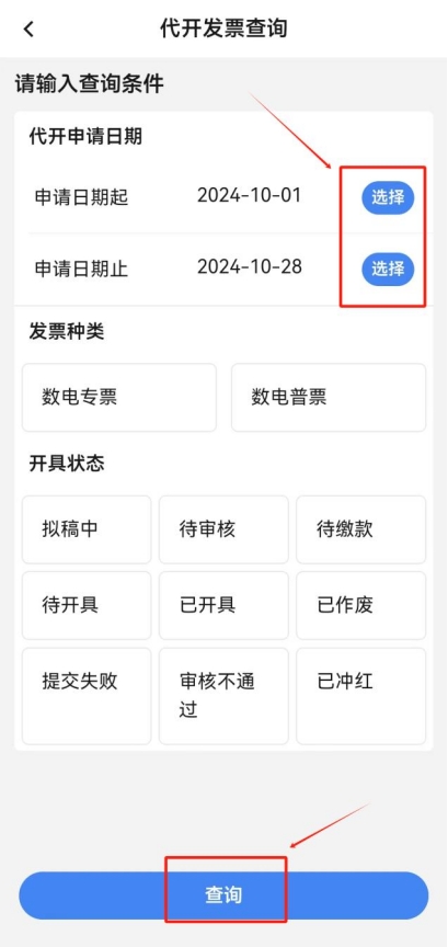 点击首页“代开增值税发票”,点击“代开发票信息查询”,选择提交申请的起止日期,点击页面下方的“查询”。
