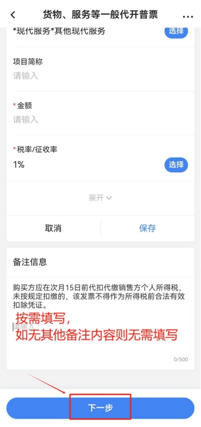 点击“项目信息”一栏中的“添加项目信息”,“项目编号名称”选择“*现代服务*其他现代服务”,“项目简称”按需据实填写(例如:劳务费/讲课费等),“金额”据实填写开票金额,“税率/征收率”选择“1%”,点击“展开”可填写更多信息,可根据开票需求自行选择填写(非必填项),填写完成后点击“保存”。