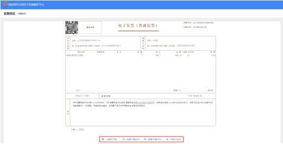 开具成功后,可以点击下载,可以二维码下载,PDF下载,OFD下载,下载为XML等形式。