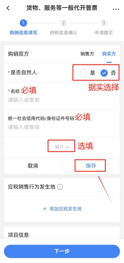 点击“购销双方”一栏中的“销售方”,核验个人身份信息是否正确(销售方仅能为登录APP的用户本人),无误后点击“购买方”,点击“添加购买方”,根据实际情况选择“是否为自然人”并填写“名称”及“统一社会信用代码/身份证件号码”(点击“展开”可填写更多信息,可根据开票需求自行选择填写,非必填项),填写完成后点击“保存”。