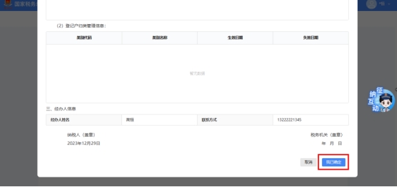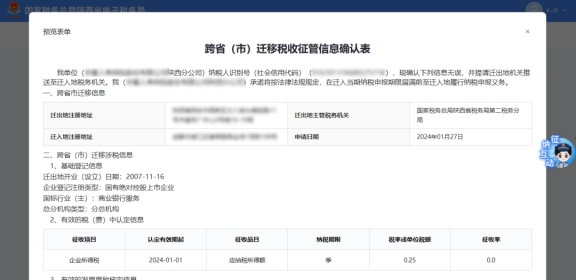 系统弹出预览表单界面,展示“跨省(市)迁移税收征管信息确认表”,点击【我已确定】。