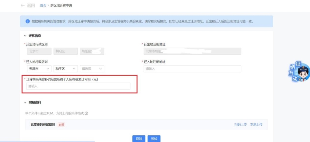 系统初始化功能界面,预填迁出地信息,手动补录迁入地省级(计划单列市级)、市级、区级行政区划以及迁入地注册地址、迁入地街道、迁移前尚未弥补的经营所得个人所得税累计亏损(元)等数据项信息,并上传已变更的外省市营业执照,点击【预检】。