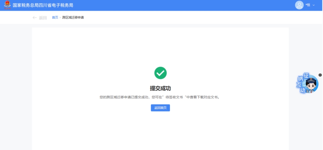 (2)当自动审核关闭时,系统提示“您的跨区域迁移申请已提交成功,请耐心等待税务机关的处理结果”。