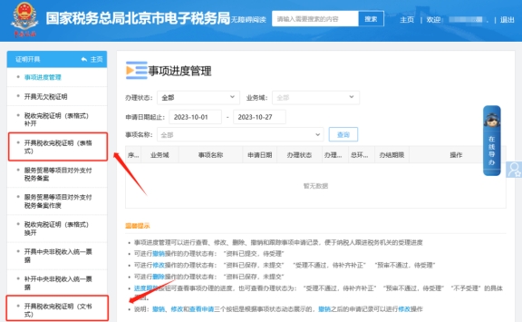 二、证明开具—开具税收完税证明(文书式)、开具税收完税证明(表格式)。