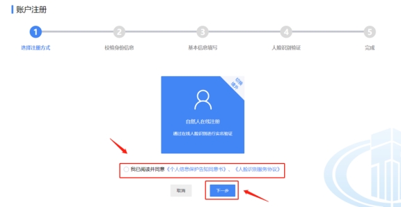 二、勾选“我已阅读并同意《个人信息?;じ嬷椤?、《人脸识别服务协议》”,点击“下一步”。