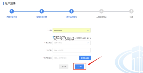四、基本信息填写可自行设置密码,密码设置要求长度为8-16个字符且必须包含数字、字母(区分大小写)、特殊字符(包括.@$% *#_+-&^)三者中至少两种,填写手机号,点击“获取验证码”。查收手机短信,填写短信验证码,点击下一步;进行人脸识别验证。