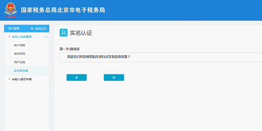 7.? 纳税人点击“确定”按钮后,进入实名认证界面,出现选择提示“您是否已经在税务机关进行过实名信息采集”,点击“是”进入关联实名信息界面;点击“否”进入立思辰人脸识别验证界面;