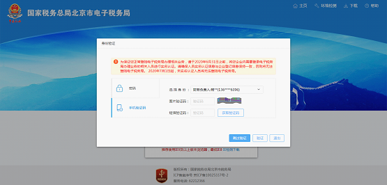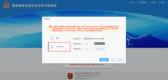 2.? 选择手机验证码登录,输入图片验证码,点击“获取验证码”按钮,短信平台会向该人员实名认证时登记的手机号发送验证码信息;输入短信验证码,点击“验证”按钮,即可进入电子税务局首页界面;