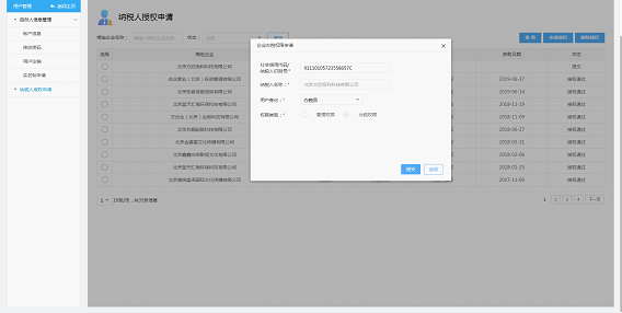 2)? 纳税人点击“申请授权”按钮后,填写相关信息,选择用户身份,点击“提交”按钮。