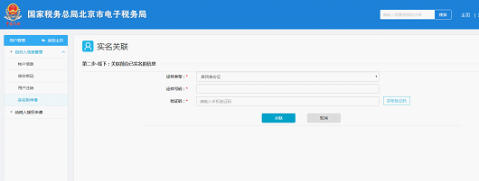 8.? 纳税人点击“是”,进入实名关联信息界面,选择相关信息填写后,进行信息验证后,点击“关联”按钮。