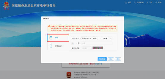 1.? 选择密码方式登录,选择需要登录电子税务局的人员身份,输入密码(密码为电子税务局个人账号登录密码)、图片验证码,点击“验证”按钮,即可进入电子税务局首页界面;