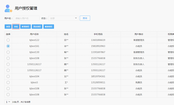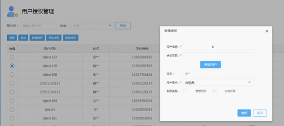 11.????? 企业授权:纳税人还可进行新增授权操作,输入用户信息和手机号码,查询出需要授权的相关用户,选择用户身份,点击授权即可。