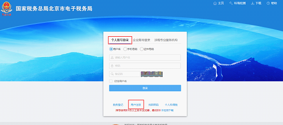 1.? 纳税人进入北京市电子税务局系统,点击“用户注册”按钮,进行用户注册;