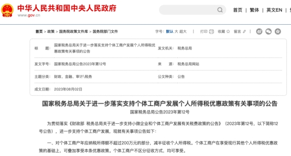 《国家税务总局关于进一步落实支持个体工商户发展个人所得税优惠政策有关事项的公告》(国家税务总局公告2023年第12号)