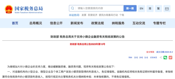 《财政部 税务总局关于支持小微企业融资有关税收政策的公告》(财政部 税务总局公告2023年第13号)