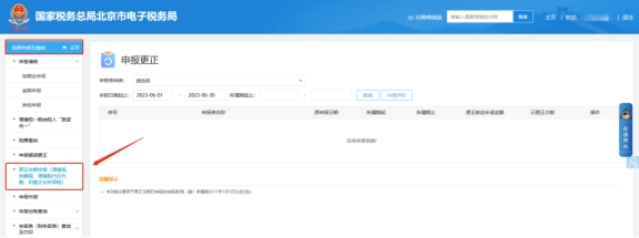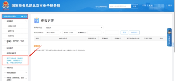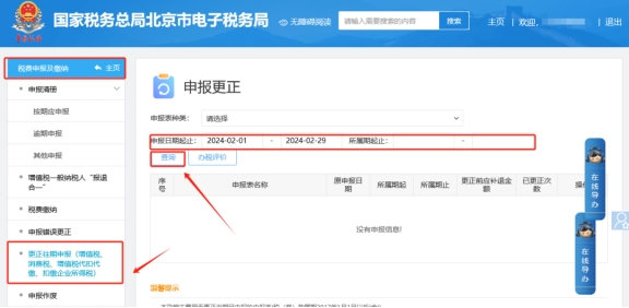 二、税费申报及缴纳,更正往期申报(增值税、消费税、增值税代扣代缴、扣缴企业所得税)???,根据查询条件找到报表后点击右侧的“更正申报”按钮进入表单完成修改及申报。