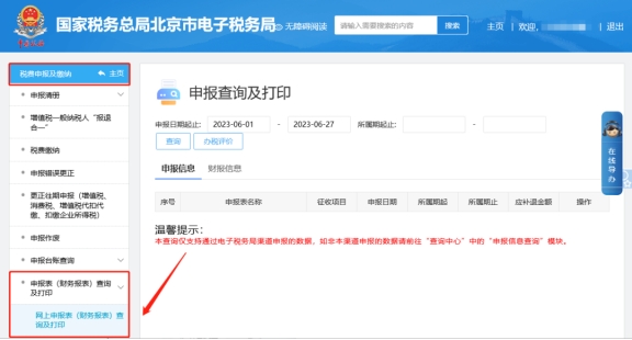 二、税费申报及缴纳—申报表(财务报表)查询及打印—网上申报表(财务报表)查询及打印??椴檠潞蟮谋ū硇畔⒓纯?。