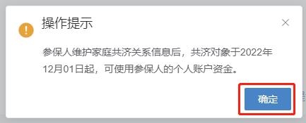 第三步:查看【操作提示】:参保人维护家庭共济关系信息后,共济对象于2022年12月01日起,可使用参保人的个人账户资金。点击【确定】按钮。