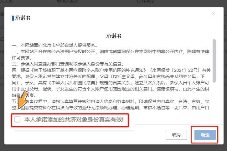 第二步:查看承诺书,勾选【本人承诺添加的共济对象身份真实有效!】,点击【确定】按钮。