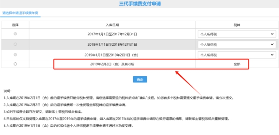 三、三代手续费支付申请页面,进入后选择2019年2月2日(含)及其以后点击确定按钮,进入下一步,选择开户银行、银行账号、填写经办人及联系电话,检查带出的信息(税款类型、税种、税款所属期、入库金额、支付比例、手续费金额)是否正确,确认无误后点击提交申请按钮即可。