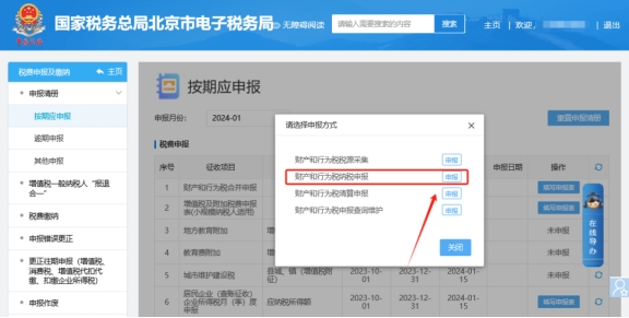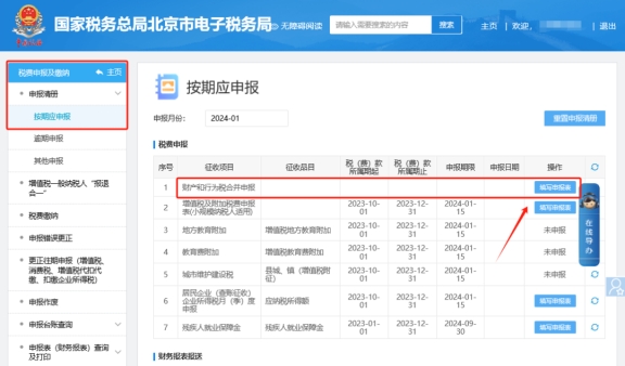 二、税费申报及缴纳—申报清册—按期应申报—财产和行为税合并申报。