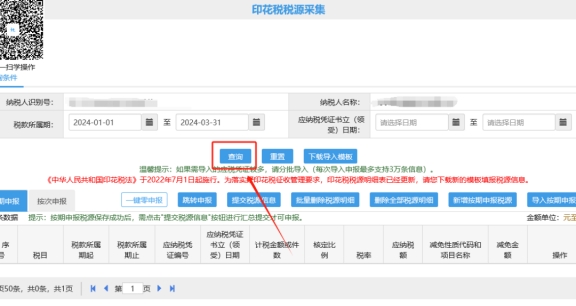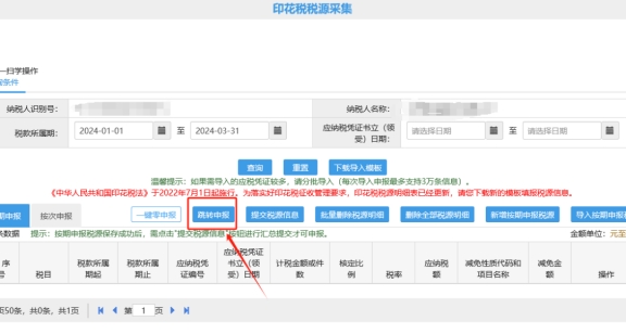 若您未进行印花税按期税源采集,请在【财产和行为税纳税申报】界面点击【印花税】后端的税源采集,点击【新增按期申报税源】录入税源信息后点击下方【保存】,调整税款所属期点击【查询】,在税源采集界面查询到已保存的税源信息后,勾选税源信息点击【跳转申报】,在【财产和行为税纳税申报】界面左上角,税款所属期选择自选,输入税款所属期起止时间,点击【查询】,然后勾选印花税点击下方【申报】。