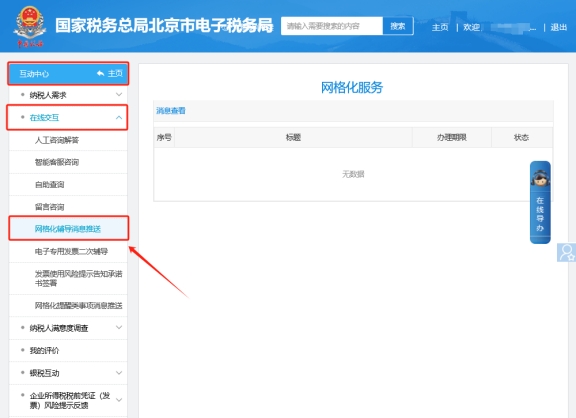 答、您好,请点击【互动中心】—【在线交互】—【网格化辅导消息推送】或【网格化提醒类事项消息推送】查看。