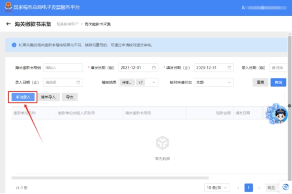 三、海关缴款书采集页面,点击【手动录入】录入海关缴款书信息,点击“确定”成功后,稍后可在查询界面根据需要输入或选择相关查询条件,然后点击“查询”按钮,在结果展示区显示符合查询条件的海关缴款书。